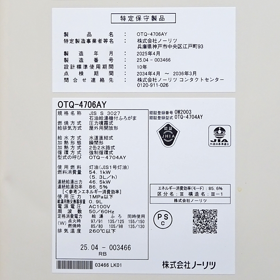 NORITZ【OTQ-4706AY】ノーリツ 石油ふろ給湯機 フルオート 屋外据置形 2025年製 未使用品
